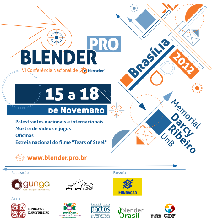 O Estúdio Gunga, em parceria com o Phoinx, realiza entre os dias 15 e 18 de novembro a VI Conferência Nacional de Blender 3D, a BlenderPro 2012. No ano que se comemora 10 anos do software, a temática é Efeitos Visuais (VFX). Durante quatro dias, a capital vai reunir palestrantes nacionais e internacionais para realizar seminários e oficinas sobre efeitos especiais em 3D e criação de jogos. A conferência será realizada no Memorial Darcy Ribeiro, da Universidade de Brasília (UnB). As inscrições estão abertas no site do evento: www.blender.pro.br.