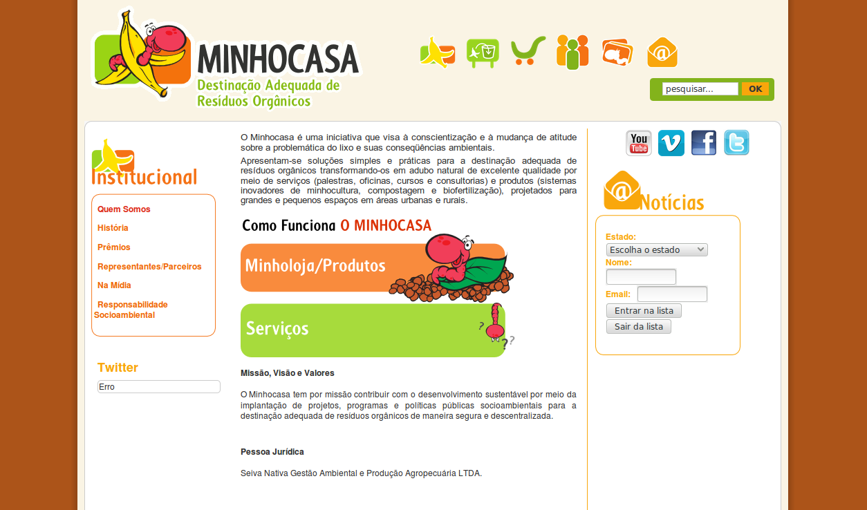 O Minhocasa é uma iniciativa que visa à conscientização e à mudança de atitudes sobre a problemática do lixo e suas consequências ambientais. A iniciativa tem por missão contribuir com o desenvolvimento sustentável, por meio da implantação de projetos, programas e políticas públicas socioambientais para a destinação adequada de resíduos orgânicos de maneira segura e descentralizada.