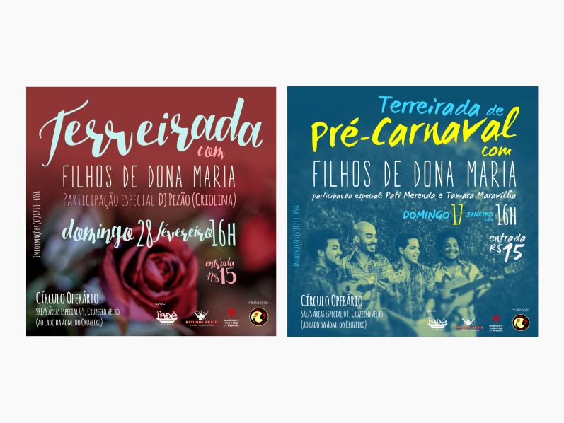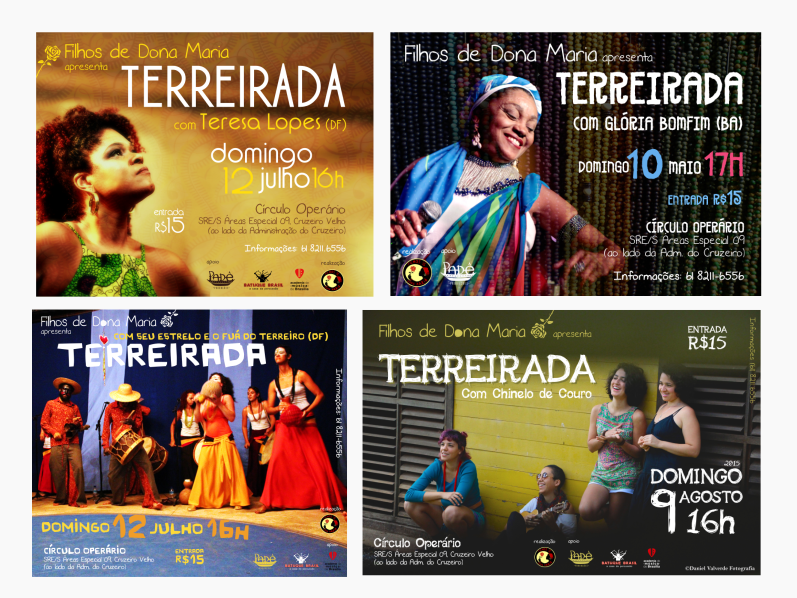 Evento mensal, realizado pelo grupo brasiliense Filhos de Dona Maria, no Círculo Operário do Cruzeiro. A inspiração do evento vem dos tambores e temperos do terreiro de matriz africana, com samba de roda, chula, afoxé e jongo. No Terreirada, Filhos de Dona Maria recebem sempre convidados especiais para abrir a roda e celebrar o culto às raízes afro-brasileiras.